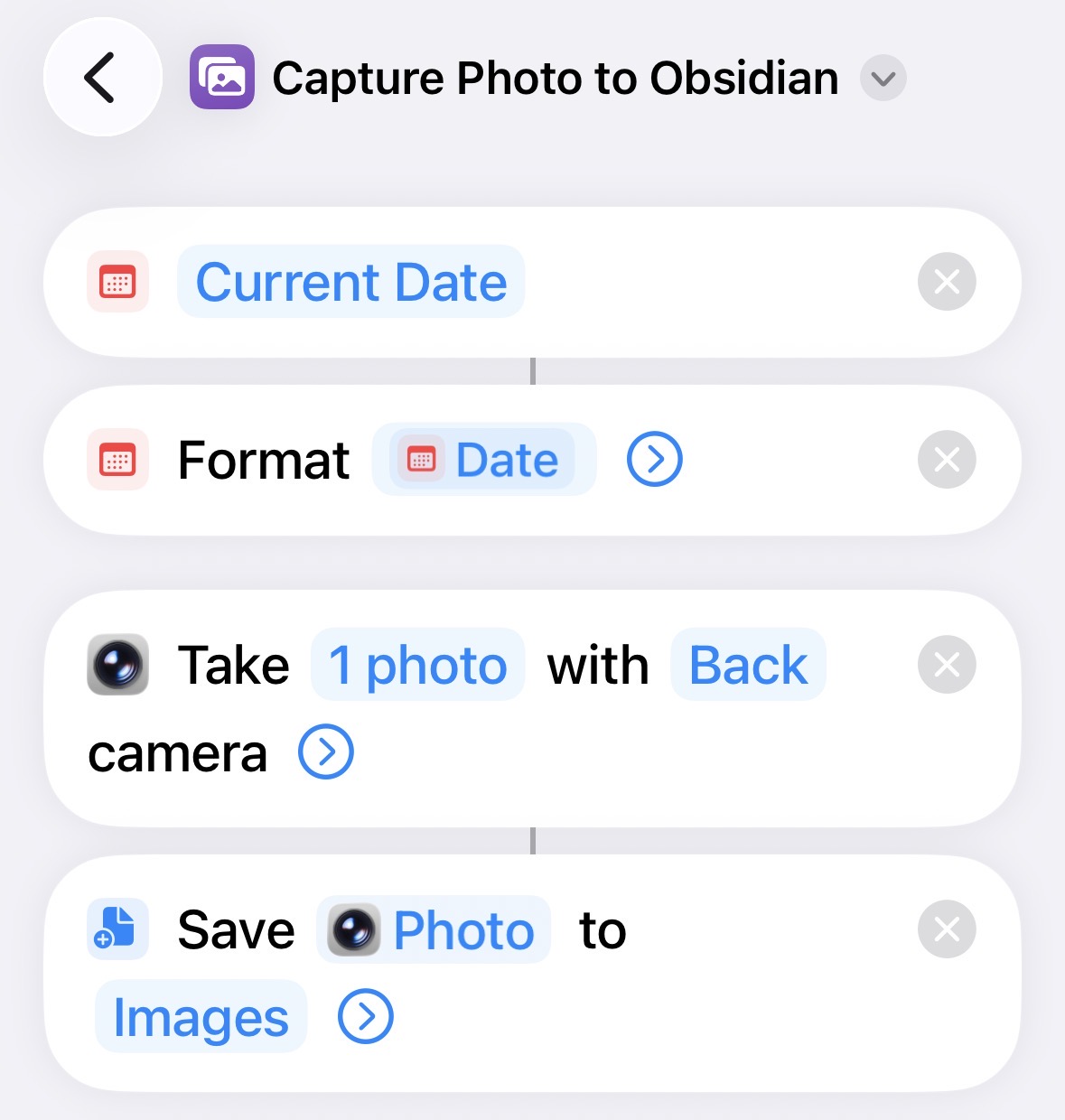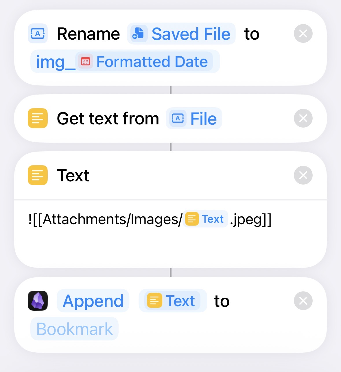 - Save that photo in iCloud (I keep my Obsidian vault in iCloud, you could modify this with other syncing arrangements)