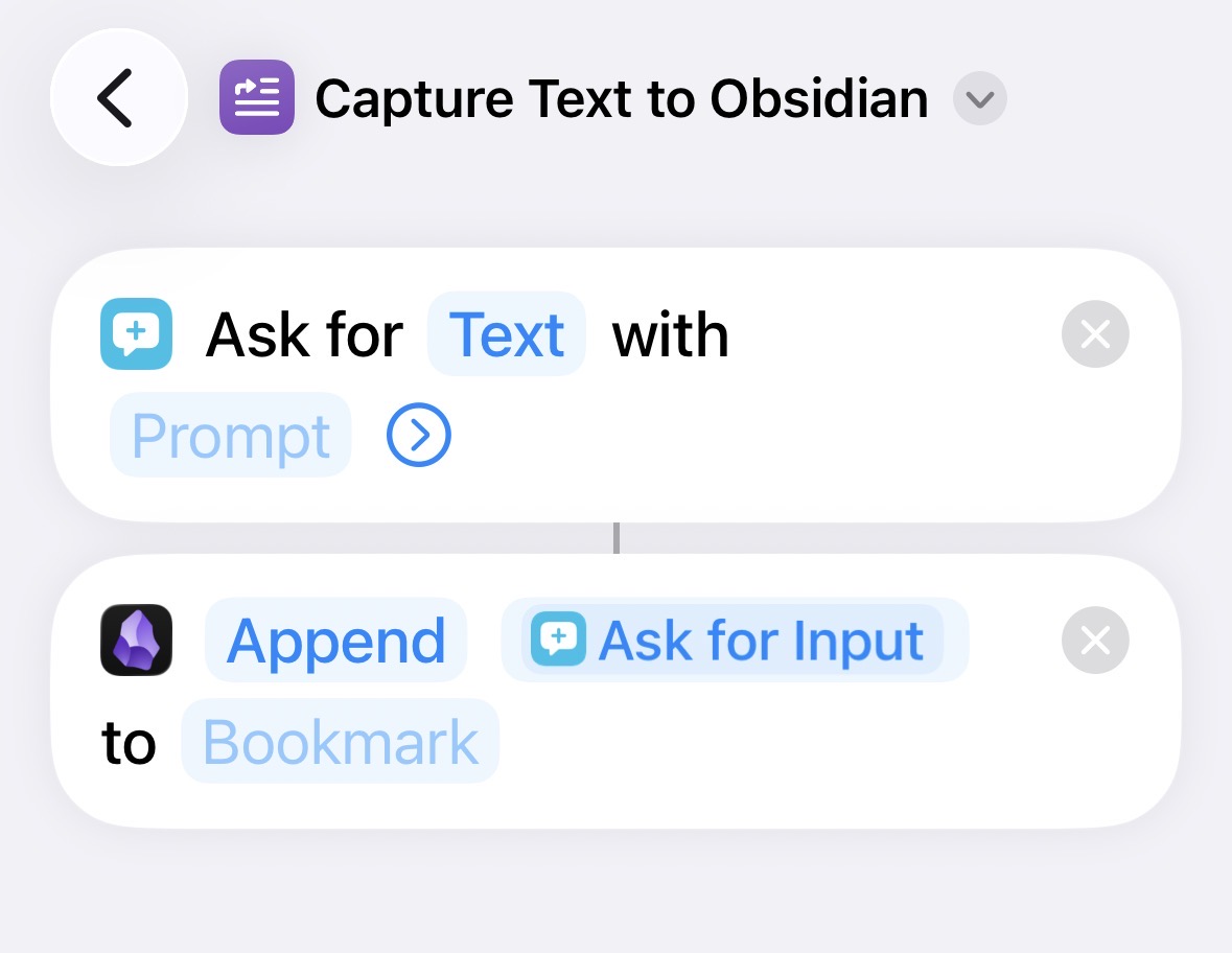 The new “Append to bookmarked note” Apple Shortcut action allows for very quick processing. As long as I have set up a note for the session ahead of time, something I try to do when going through the conference schedule ahead of time, and bookmark these notes, adding text to them is simple. The shortcut, shown below, is very simple–prompt for text and feed that text into the bookmarked note. Importantly, the Obsidian action allows you to pick from your bookmarked notes, so as long as you don’t use bookmarks as some kind of staging area (I hardly use them at all), you’ll have a very short list to choose from.